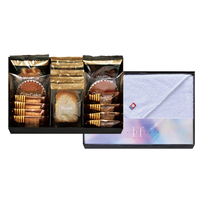 バニラ風味のプレーンケーキにメープルの風味が食欲をそそるメープルケーキ、ベルギー産の粒状砂糖「パールシュガー」を加え、食感にアクセントをつけた程よい甘さのプレーンワッフルとやわらかな生地にカリカリとした食感がアクセントのチョコレート風味のチョコワッフル、甘さを抑え軽い食感に仕上げたシュガーラスクや香ばしいココナッツの風味が広がるさくっとした食感のココナッツラスク、可愛らしい一口サイズの2種類のパイなど、こだわりのベイクドスイーツと今治タオルの詰合せです。