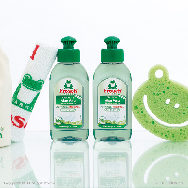 手肌と環境にやさしい食器用洗剤 生分解性の高い界面活性剤を使用し、エコでありながら強力な洗浄力を持つ「フロッシュ」は、天然アロエヴェラエキス配合。